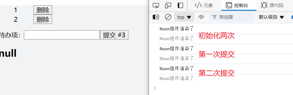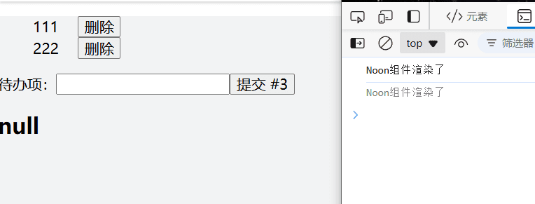 tsxconst App: FC<PropTypes> = () => { return ( <ContextApp> <ToDoList></ToDoList> <ToDoInput></ToDoInput> <Noon></Noon> </ContextApp> ) } const ContextApp = ({ children }) => { const [state, dispatch] = useReducer(reducer, []) return <TodoListContext.Provider value={{ state, dispatch }}>{children}</TodoListContext.Provider> } const Noon = () => { console.log('Noon组件渲染了') return ( <> <h2>null</h2> </> ) }