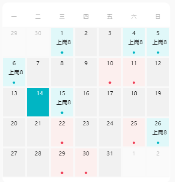 scss// 统计页面的日历样式 .date-cell.plain { padding: 24rpx 0; width: 100%; height: 60rpx; display: flex; flex-direction: column; justify-content: center; align-items: center; position: relative; &.other-month { .date-number { color: #ddd; } } &.today { .date-number { width: 40rpx; background-color: #01b5c3 !important; border-radius: 50%; color: #fff; } } &.today, &.active { .date-number { width: 40rpx; background-color: #01b5c3 !important; border-radius: 50%; color: #fff; } } .date-number { display: flex; width: 32rpx; height: 40rpx; flex-direction: column; justify-content: center; flex-shrink: 0; color: #000000; text-align: center; font-family: 'MiSans'; font-size: 24rpx; font-style: normal; font-weight: 400; line-height: 40rpx; } .status-dot { margin-top: 12rpx; position: absolute; bottom: 16rpx; left: 50%; transform: translateX(-50%); width: 8rpx; height: 8rpx; border-radius: 50%; background-color: var(--type-color, red); } } // 排班日历页面的日历样式 .date-cell.primary { box-sizing: border-box; padding: 4rpx; position: relative; width: 100%; height: 124rpx; background-color: #f9f9f9; .primary-container { height: 100%; display: flex; justify-content: flex-start; flex-direction: column; align-items: center; background-color: var(--type-color2, #f1f1f1); } &.today { .primary-container { background-color: #01b5c3 !important; } .date-number { color: #ffffffe6; &::before { content: '0'; color: transparent; } } .date-desc { color: #ffffff; } } &.other-month { .primary-container { background-color: #fafafa !important; } .date-number { color: #0000004d; } .date-desc { color: transparent; } } .date-number { color: #000000e6; text-align: center; font-family: 'MiSans'; font-size: 24rpx; font-style: normal; font-weight: 500; line-height: 40rpx; } .date-desc { color: #191919; text-align: center; font-family: 'MiSans'; font-size: 24rpx; font-style: normal; font-weight: 400; line-height: 40rpx; &::before { content: '0'; color: transparent; } } .status-dot { margin-top: 21rpx; width: 10rpx; height: 10rpx; border-radius: 50%; background-color: var(--type-color, #01b5c3); } }