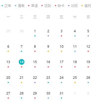 calendarDates 数据,根据实际需求可以在日历日期单元格组件中添加多种自定义样式,按需修改外部传入的单元格数据配置即可。